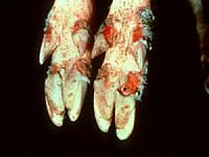 – Dê, cừu: Thời gian nung bệnh 2 – 7 ngày, dê, cừu mắc bệnh, sốt cao 41,50C trong 2 – 4 ngày, xuất hiện những mụn nước dầy đặc xung quanh miệng, sau đó đến chân, vú; mụn nước vỡ ra làm lở loét miệng nên dê, cừu đau miệng khó ăn.