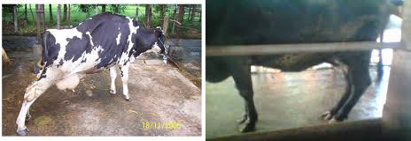Chân sau bị đau nên chân hơi co về phía trước Bò bị viêm móng nặng và khuỷu chân sưng to