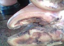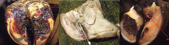 Hình trên cho thấy móng chân bị xuất huyết và vết nứt ăn sâu lên phía trên, móng bị lõm sâu vào chính giữa. Do bị xuất huyết và hoại tử nên chỗ viêm móng có màu đen.