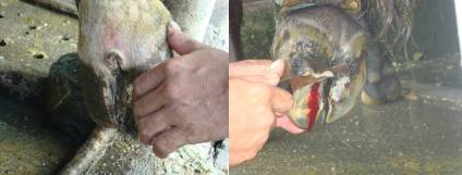 _ Móng chân bị viêm (người chăn nuôi thường gọi là hà ăn chân) thì phần móng thường bị khuyết (lõm), có khi xuất huyết hoặc mưng mủ nên có màu nâu, đen; bò đi lại khập khểnh, đứng lên nằm xuống khó khăn, sống lưng bị võng xuống khi viêm móng nặng ở 2 chân sau. Trước tiên bà con nên mời thú y đến gọt móng bằng các dụng cụ chuyên dùng. Gọt sạch chỗ bị viêm, cấp kháng sinh hoặc sulfamid vào và sau đó cho bò mang guốc để tránh bị phân nhét vào. Nếu không có guốc, nhốt bò bệnh ở một chỗ riêng, lót rơm khô và thay rơm thường xuyên, tránh nền chuồng ẩm ướt. Nếu bị nặng, kết hợp tiêm thêm kháng sinh phổ khuẩn rộng ít nhất 5 7 ngày.