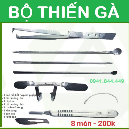 + Bộ dụng cụ thiến gà cỡ nhỏ gồm 5 món là dao mổ sắc, panh, muỗng lớn, muỗng nhỏ, kim khâu và các dụng cụ này đều cần được sát trùng kĩ trước khi thực hiện.